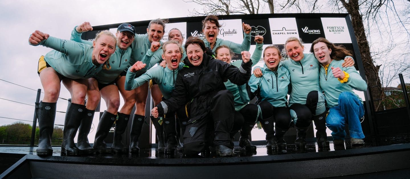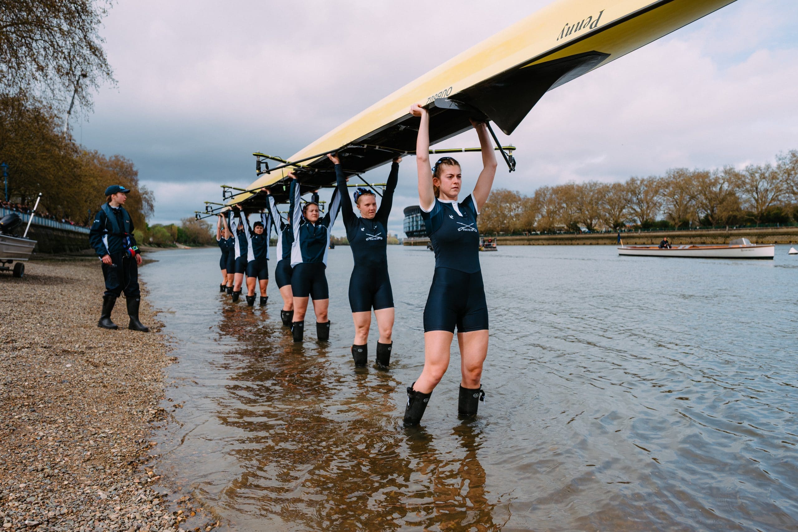 After Hammersmith, the conditions on the river deteriorated and both crews pushed on through choppy water into a strong headwind. Through the rough water, Blondie increased their lead so that there was clear water between the crews.