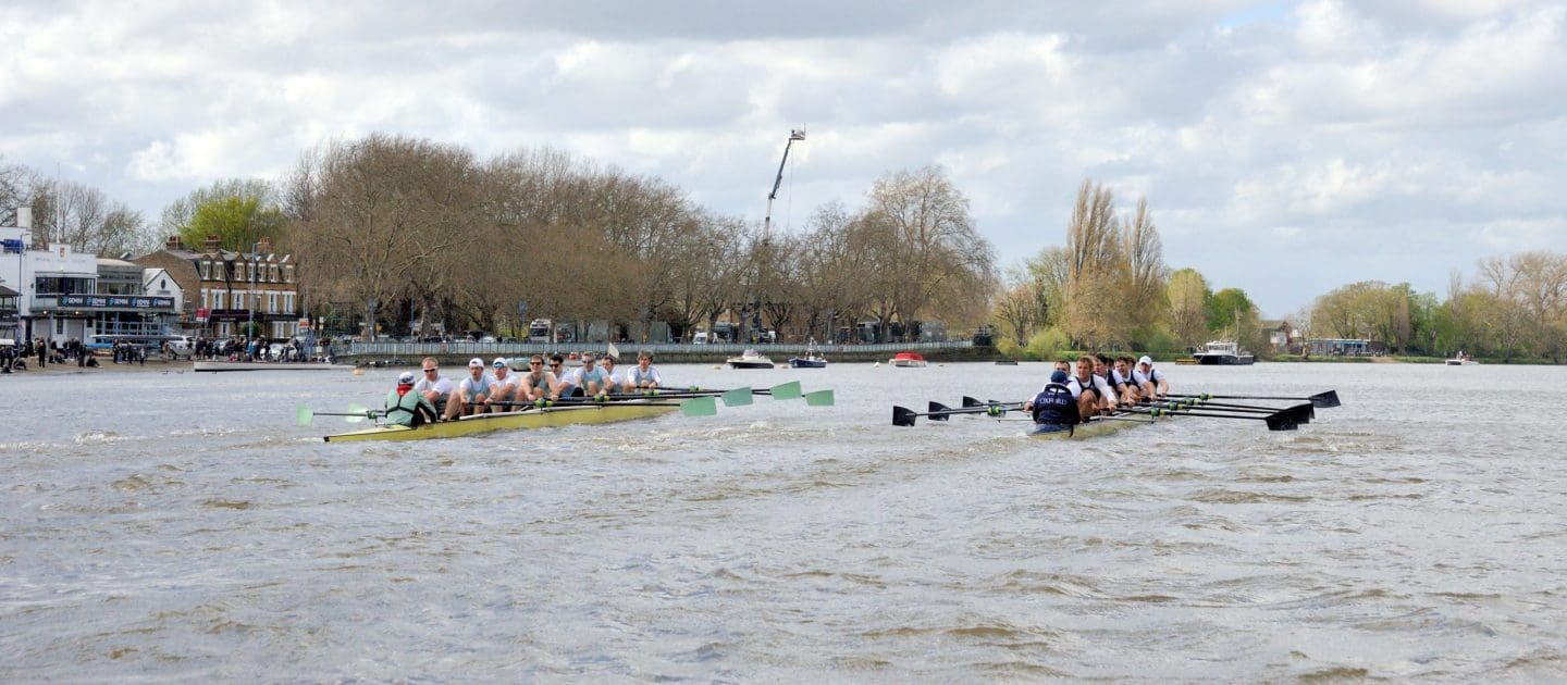 Wherever Cambridge increased their overlap with Oxford, the waves from the infamous Tideway wash set them back, enabling Oxford to maintain their three-quarter length lead.